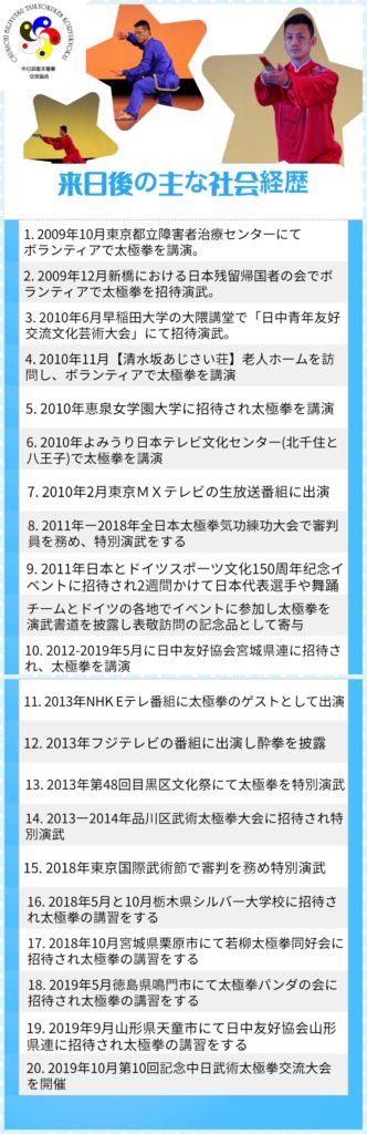 2009年8月1日より日本での太極拳指導活動始め、現在、中日武術太極拳交流協会代表に至る